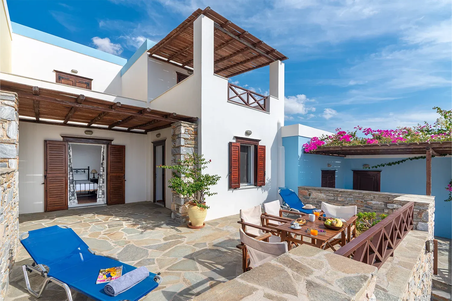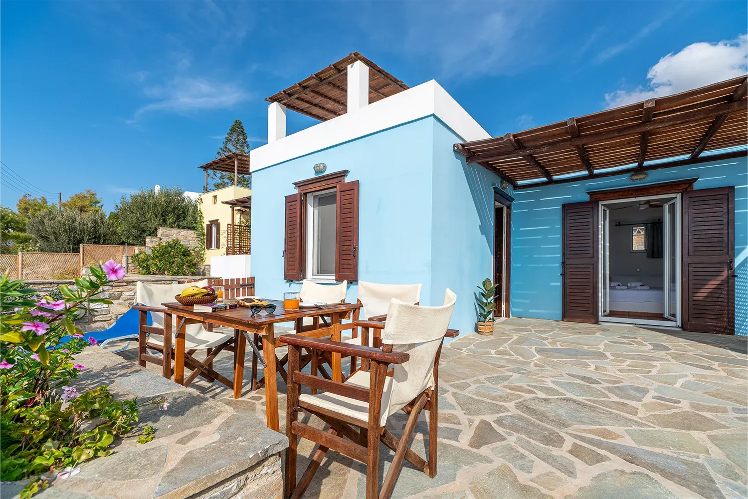 Αυτός ο τύπος διαμερίσματος έχει μέγεθος 45 τμ και διαθέτει μια ιδιωτική αυλή 50 τμ. Βρίσκεται στο πρώτο επίπεδο. Αποτελείται από ένα ξεχωριστό υπνοδωμάτιο και ένα καθιστικό με πλήρως εξοπλισμένη κουζίνα. Το διαμέρισμα Α2 διαθέτει ένα παραδοσιακό μεταλλικό κρεβάτι και το διαμέρισμα Β3 διαθέτει ένα διπλό χτιστό. Στον χώρο του καθιστικού υπάρχει ένας μεταλλικός καναπές κρεβάτι. Και τα δύο δωμάτια έχουν πανοραμική θέα την θάλασσα με μεγάλη βεράντα. Έχει χωρητικότητα 4 ατόμων. Υπάρχει η δυνατότητα προσθήκης επιπλέον κρεβατιού για το τέταρτο άτομο.